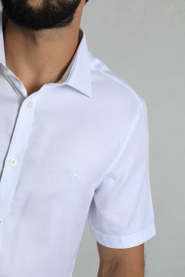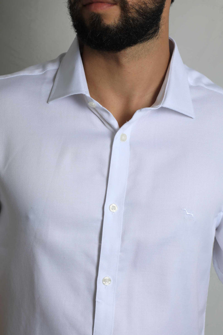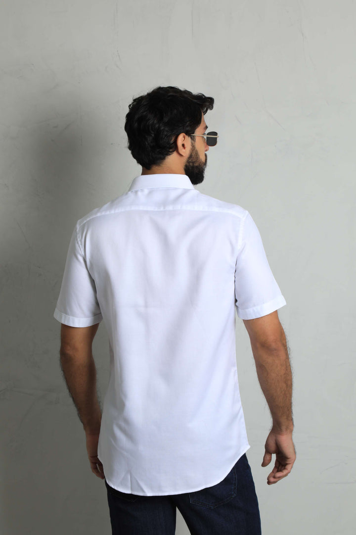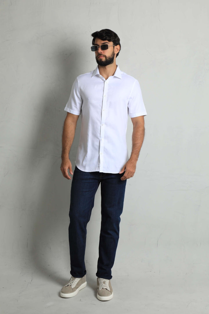 La clásica camisa blanca se renueva con un giro sutil y elegante. Confeccionada en tejido dobby, esta prenda incorpora una textura discreta que eleva su apariencia sin perder su esencia minimalista. El tejido CVC garantiza una caída ligera, frescura y fácil mantenimiento.