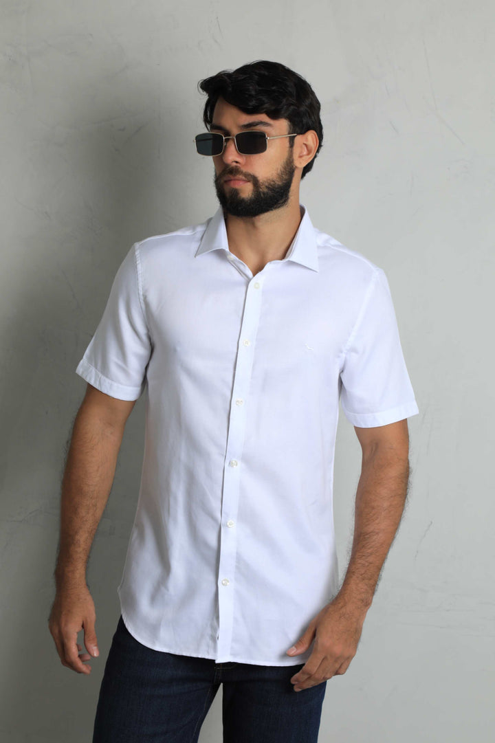 De manga corta y silueta moderna, es ideal para lograr un look pulido, ya sea formal o relajado. El acabado limpio y la textura apenas visible hacen de esta camisa una pieza infaltable para un estilo moderno, sobrio y con intención.