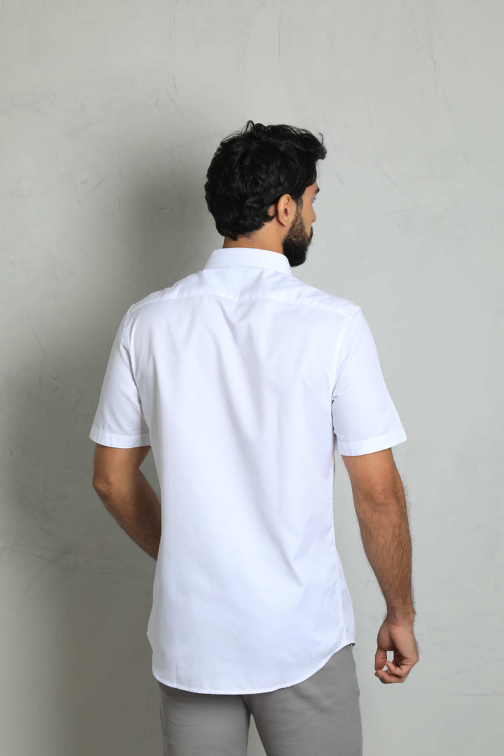 De manga corta y silueta moderna, es ideal para lograr un look pulido, ya sea formal o relajado. El acabado limpio y la textura apenas visible hacen de esta camisa una pieza infaltable para un estilo moderno, sobrio y con intención.