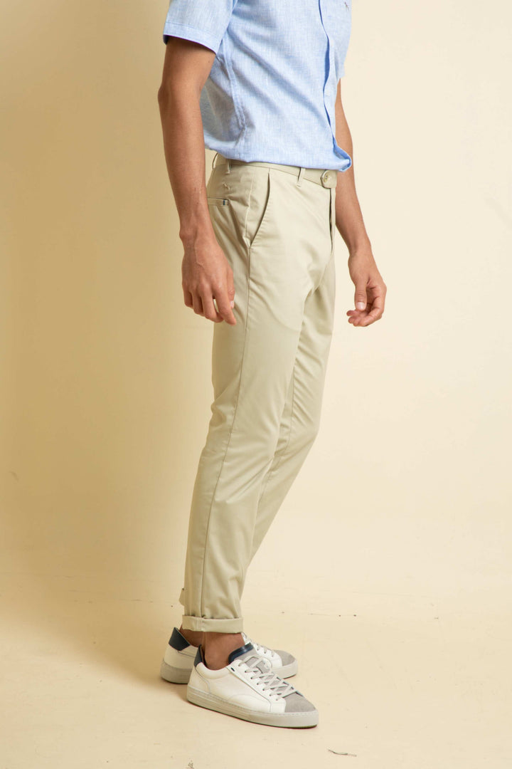 Confeccionado en tejido de algodón, mezcla de algodón con elastano. Dos bolsillos laterales. Dos bolsillos de ojal en la parte posterior. Cintura con pasadores. Cierre mediante cremallera oculta por tapeta y botón.