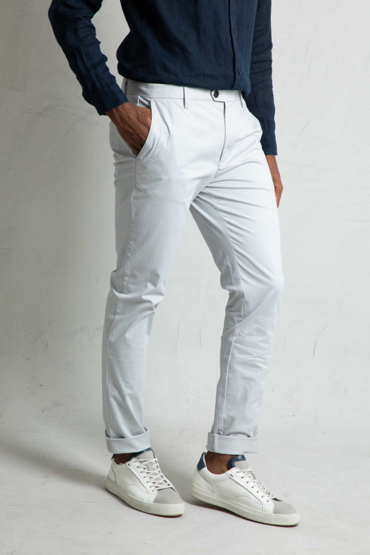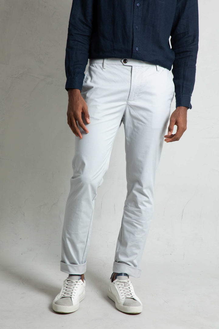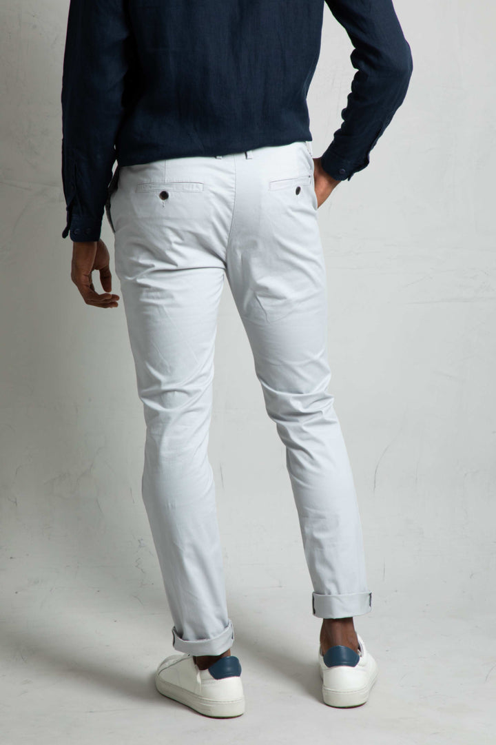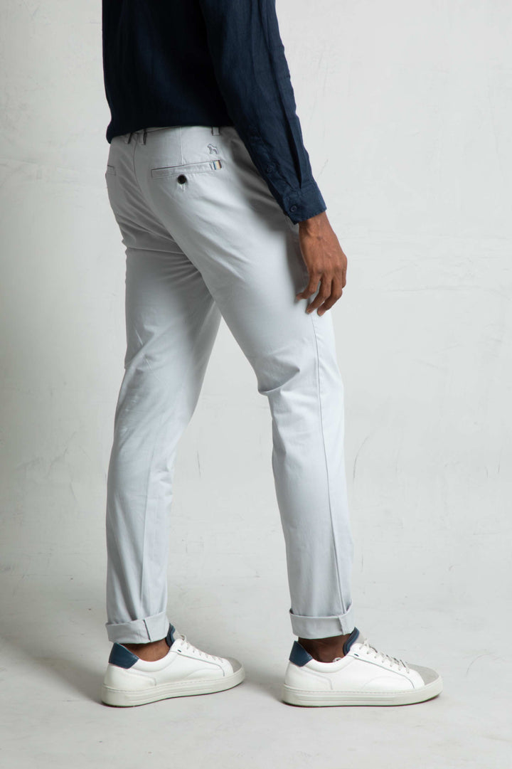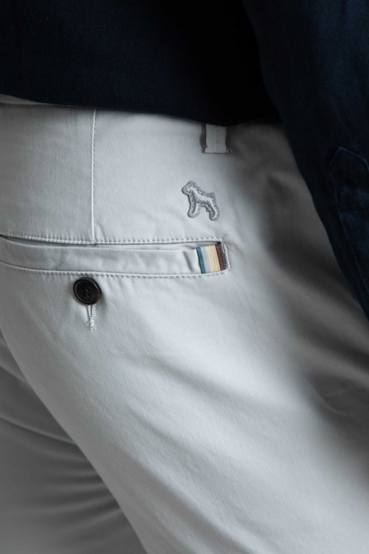 Pantalón chino slim fit confeccionado en algodón satinado con elastano, que combina confort, flexibilidad y durabilidad. Su tejido resistente mantiene la forma y el color con el uso, ideal para el día a día. Incluye pretina cruzada, bolsillos frontales diagonales con pespunte decorativo y bolsillos traseros de ribete, uno de ellos con cinta multicolor. El interior de la pretina incorpora una cinta de rayas multicolor, y el diseño se completa con un logo bordado a tono, sutil y elegante.