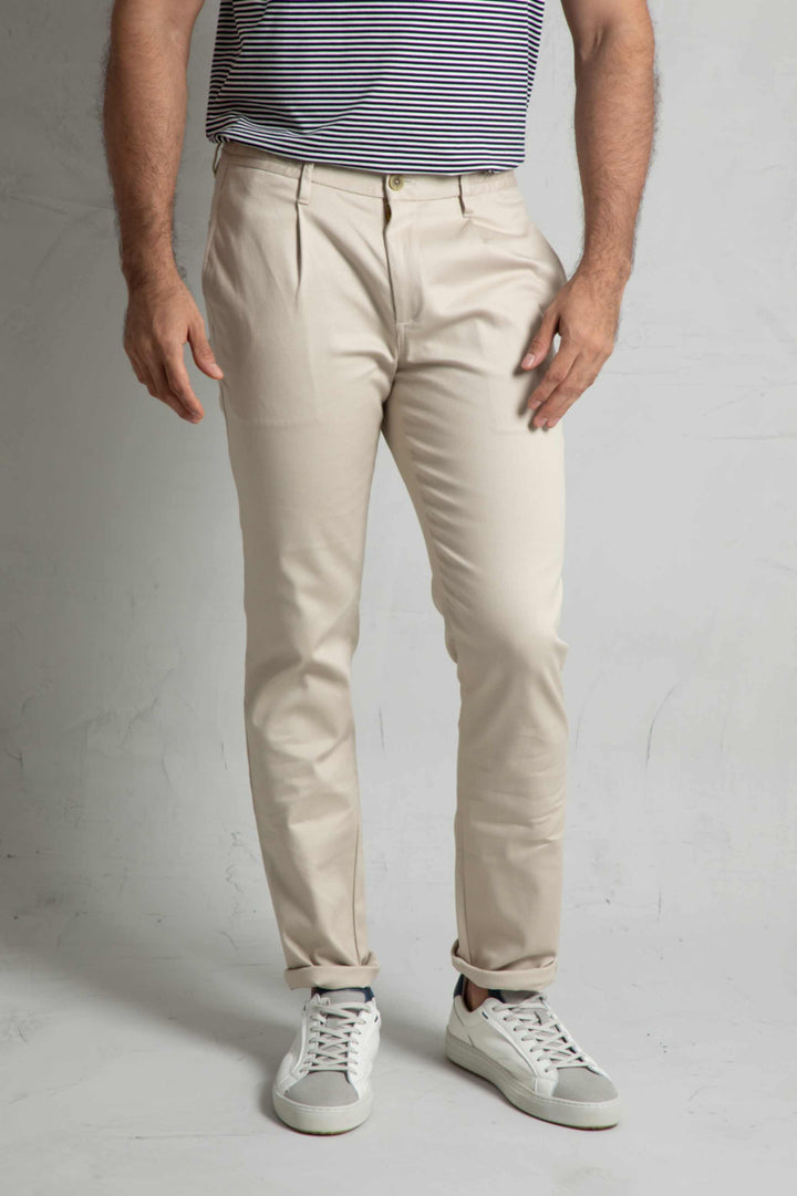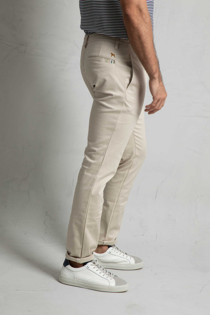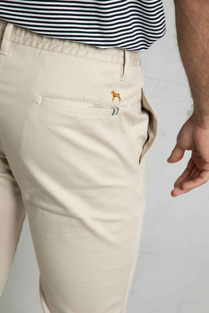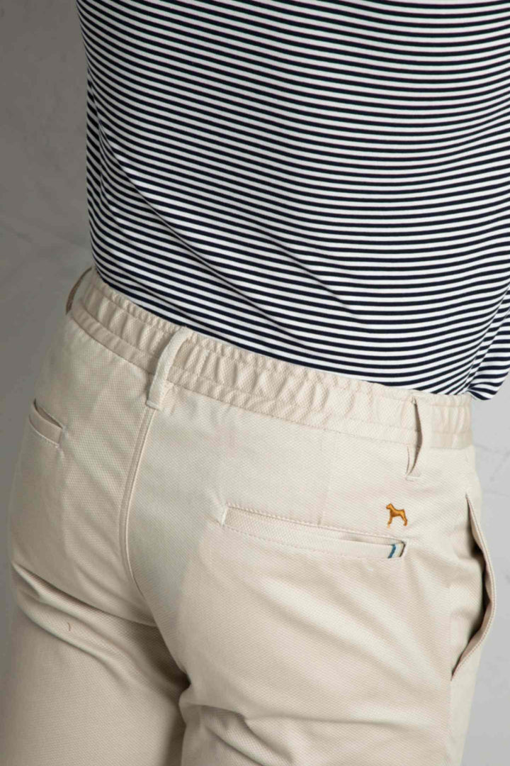 Confeccionado en tejido 97% algodón y 3% Spandex , mezcla de algodón con Spandex. Dos bolsillos laterales. Dos bolsillos de ojal en la parte posterior. Cintura con elastico y pasadores. Cierre mediante cremallera oculta por tapeta y botón.