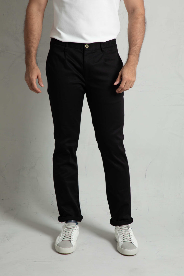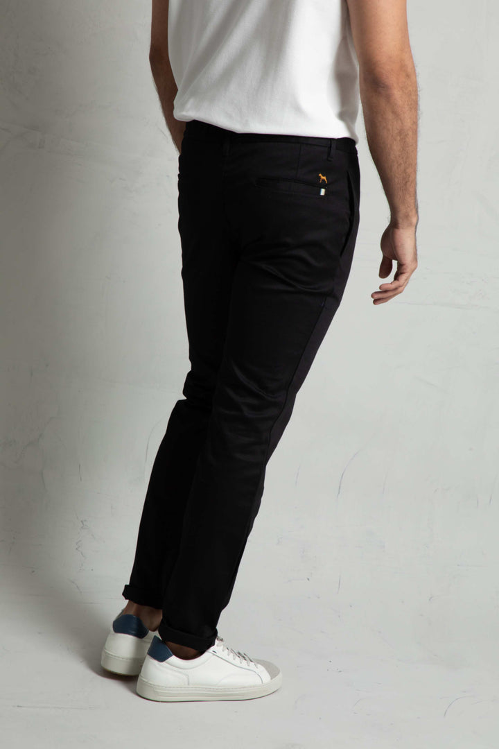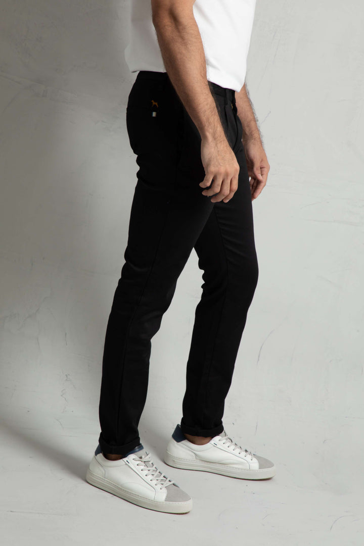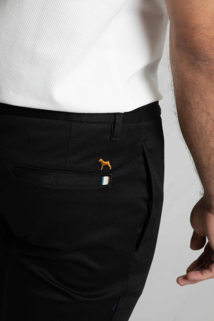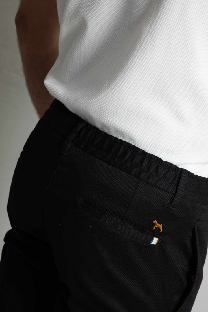 Confeccionado en tejido 97% algodón y 3% Spandex , mezcla de algodón con Spandex. Dos bolsillos laterales. Dos bolsillos de ojal en la parte posterior. Cintura con elastico y pasadores. Cierre mediante cremallera oculta por tapeta y botón.