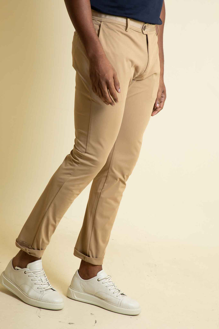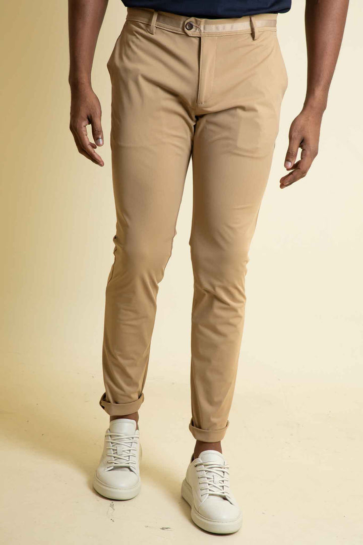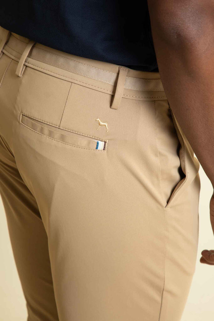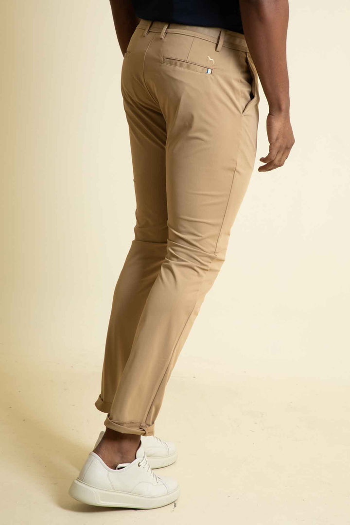 Confeccionado en tejido de algodón, mezcla de algodón con elastano. Dos bolsillos laterales. Dos bolsillos de ojal en la parte posterior. Cintura con pasadores. Cierre mediante cremallera oculta por tapeta y botón.