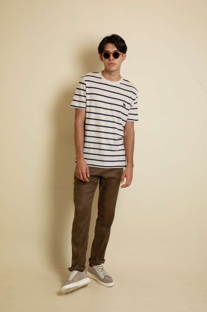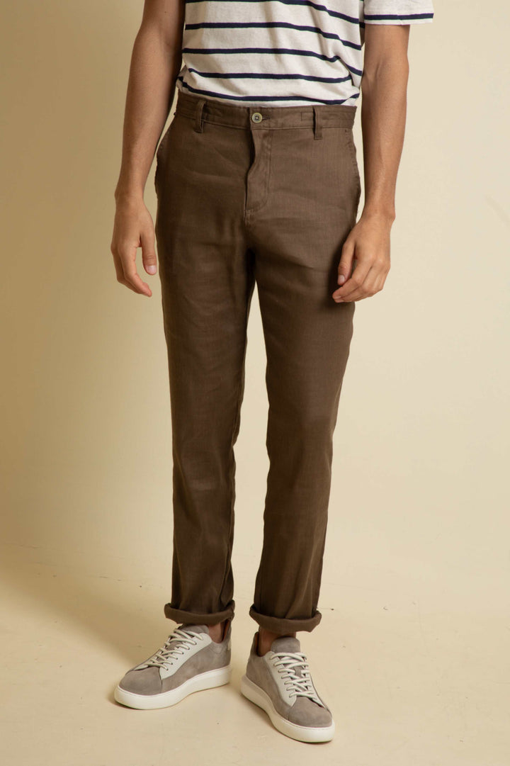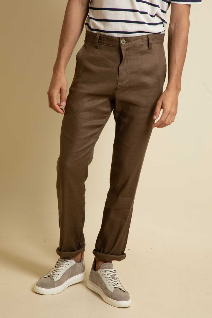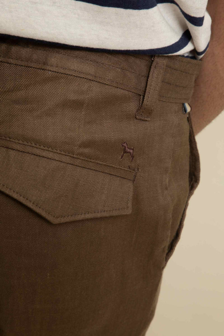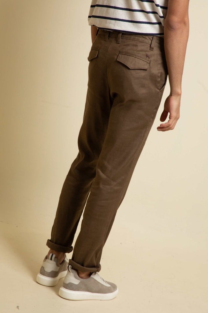 Confeccionado en tejido 66% Lino, 42% Viscosa y 3% Spandex. Dos bolsillos laterales. Dos bolsillos de ojal en la parte posterior. Cintura con pasadores. Cierre mediante cremallera oculta por tapeta y botón.