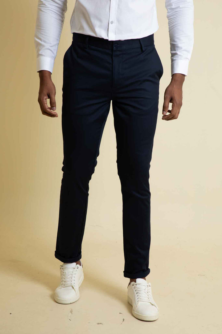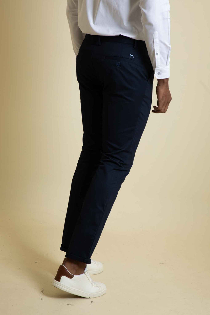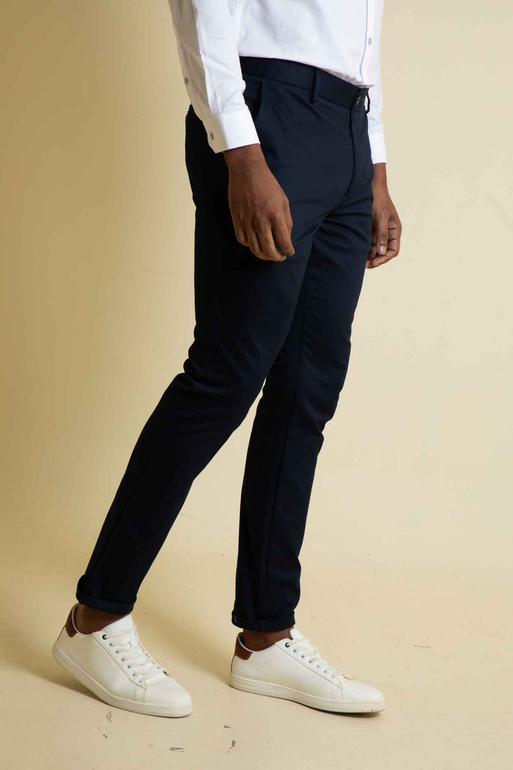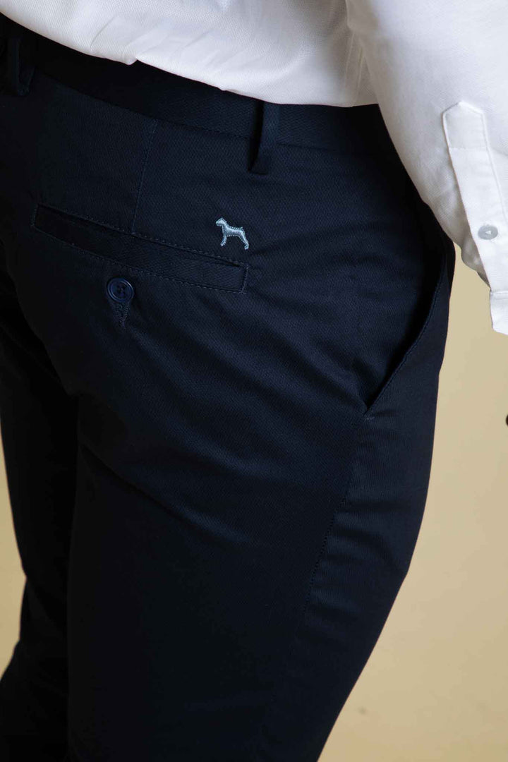 Confeccionado en tejido de algodón, mezcla de algodón con elastano. Dos bolsillos laterales. Dos bolsillos de ojal en la parte posterior. Cintura con pasadores. Cierre mediante cremallera oculta por tapeta y botón.