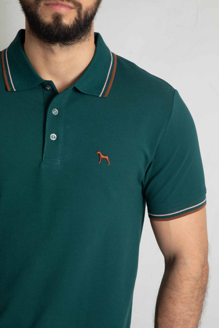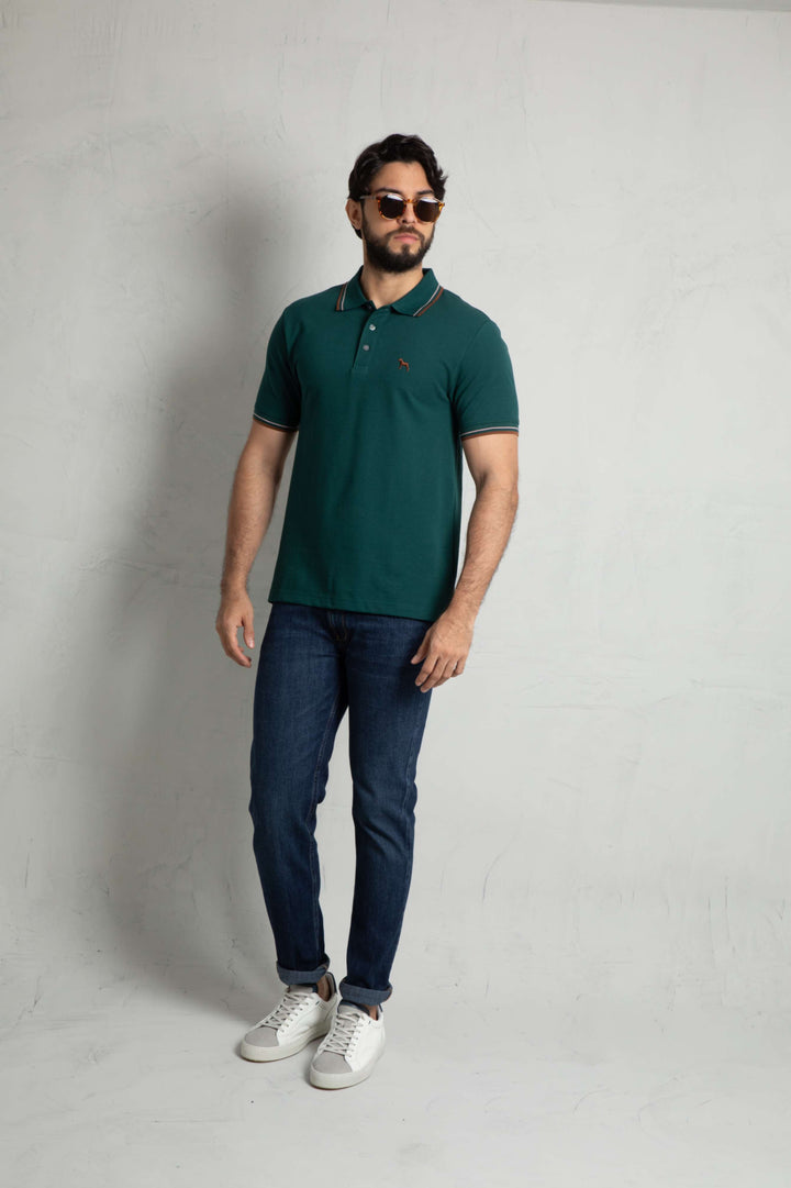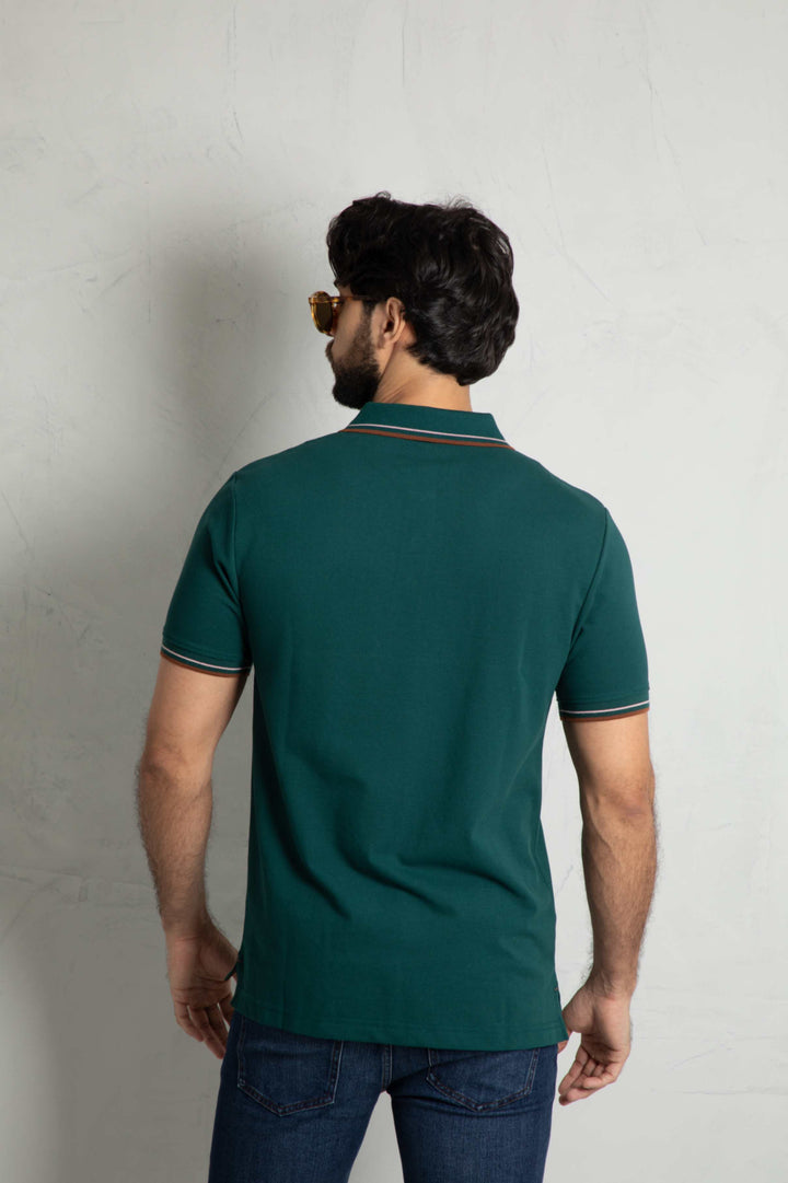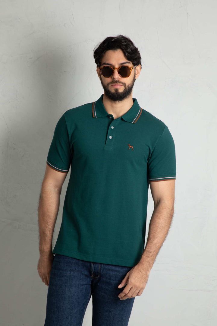 Confeccionado en tejido de piqué con algodón y poliéster. Cierre mediante plaqueta de tres botones. Cuello y puño en rib con tippings en contrastes- manga corta.