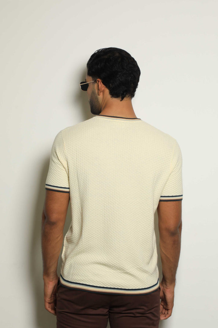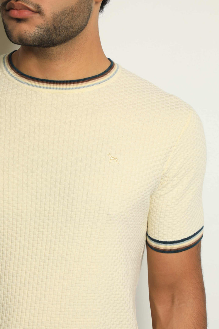 Confeccionado en algodón puro, este suéter destaca por su suavidad, frescura y comodidad natural. El diseño se eleva con un rib en contraste que incorpora líneas decorativas multicolor, aportando un toque moderno, vibrante y lleno de personalidad.